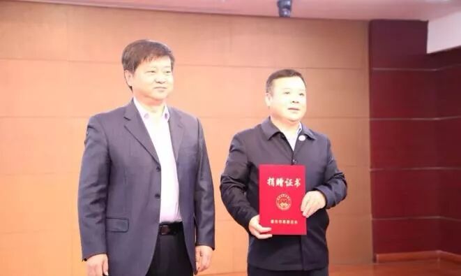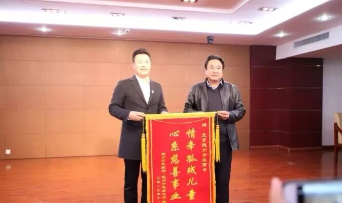 市委统战部副部长、市工商联党组书记赵金刚同志向北京德州企业商会监事长、北京宁津企业商会会长孙浩天(孙玉州)颁发爱心锦旗。